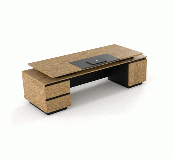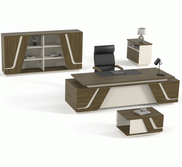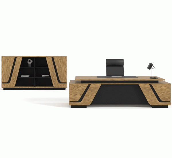 Ahşap yüzeylerde tercih edilen doğal tonlar ise sıcaklık hissini artırarak ofis ortamını daha davetkâr hale getiriyor.Asil Makam Takımı geniş ve kullanışlı yüzeyi, hem çalışma konforu sağlıyor hem de güçlü bir duruş sergilemektedir.Masanın ön panelindeki geometrik form ve kontrast renk kullanımı, yöneticinin otoritesini vurgulayan bir tasarım dili oluşturmaktadır.Aynı zamanda masa üzerinde düzeni korumaya yardımcı olacak sade bir yerleşim anlayışı benimsenmitir.Asil Makam Takımı'nın tamamlayıcı parçaları olan etajer, sehpa ve dolabı hem estetik bütünlüğü koruyor hem de fonksiyonel depolama çözümleri sunmaktadır.Özellikle açık raflı dolap tasarımı, dekoratif objelerle kişiselleştirme imkânı sağlarken, kapalı bölmeler düzenli bir görünüm elde edilmesine yardımcı olmaktadır.Renk uyumu açısından değerlendirildiğinde, krem ve ahşap tonlarının dengeli kullanımı dikkat çekiyor. Bu kombinasyon, göz yormayan bir sadelik sunarken aynı zamanda profesyonel bir atmosfer yaratıyor. Beyaz detaylar ise tasarıma modern bir kontrast kazandırmaktadır.Asil Makam Takımı'nın masası 240cm. ve 260cm.olarak iki ayrı ölçülerde ürtetilmektedir.