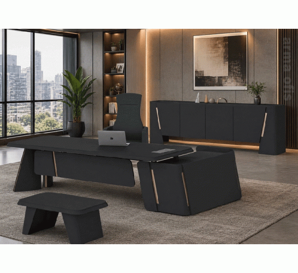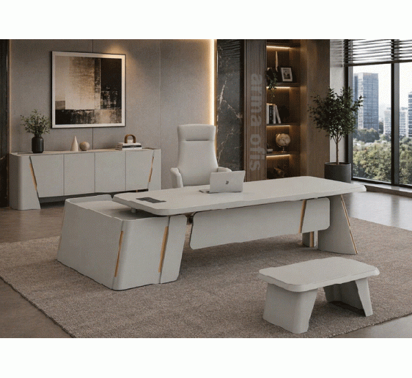 Over Makam Takımı, modern tasarım anlayışını yalınlık ve fonksiyonellikle birleştiren güçlü bir estetik sunuyor. Açık gri tonlarının ve siayhın hâkim olduğu yüzeyler, mekâna ferahlık ve dinginlik katarken; minimal çizgiler, gereksiz detaylardan arındırılmış bir sadelik anlayışını yansıtıyor.Masanın geniş ve kesintisiz yüzeyi, kullanıcıya konforlu bir çalışma alanı sağlarken, entegre edilmiş yan ünite hem depolama hem de estetik denge açısından önemli bir rol üstleniyor. Keskin olmayan, yumuşatılmış köşe geçişleri ve geometrik form dili, tasarımın hem çağdaş hem de ergonomik bir karaktere sahip olduğunu göstermektedir. Aynı zamanda masa ile bütünleşik formda tasarlanmış ayak yapısı, ürüne güçlü ve dengeli bir duruş kazandırmaktadır.Over Ofis Takımı'nın arka kısmında yer alan konsol, depolama ihtiyacını şık bir şekilde çözerken, yüzeyinde kullanılabilecek dekoratif objelerle mekâna kişisel bir dokunuş katma imkânı sunuyor. İnce metal detaylar ise açık gri rengin ve siyahın sadeliğini kırarak tasarıma sıcaklık ve sofistike bir kontrast kazandırmaktadır. Bu küçük ama etkili dokunuşlar, Over Makam Takımı'nın karakterini zenginleştirmektedir..
