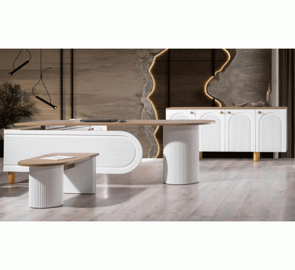 Pamukkale Ofis Takımı,modern tasarım anlayışını fonksiyonellikle birleştiren estetik bir çalışma alanı sunuyor.Günümüz ofis trendlerinde sıkça görülen minimalizm ve doğal malzeme kullanımı, bu takımda oldukça dengeli ve şık bir şekilde bir araya getirilmiştir.Öncelikle masa tasarımına bakıldığında, yuvarlatılmış hatların sert köşeleri ortadan kaldırarak daha yumuşak ve şık bir görünüm oluşturduğu dikkat çekiyor. Ahşap yüzey,ortama sıcaklık katarken beyaz detaylarla yapılan kontrast, modern bir hava kazandırıyor. Masanın yan kısmında yer alan kapaklı ve çekmeceli depolama alanı ise hem düzen hem de kullanım kolaylığı sağlıyor. Bu sayede hem estetik hem de işlevsellik aynı noktada buluşuyor.Pamukkale Ofis Takımı ile ilgili daha detaylı bilgi için bizimle iletişim kurabilirsiniz.